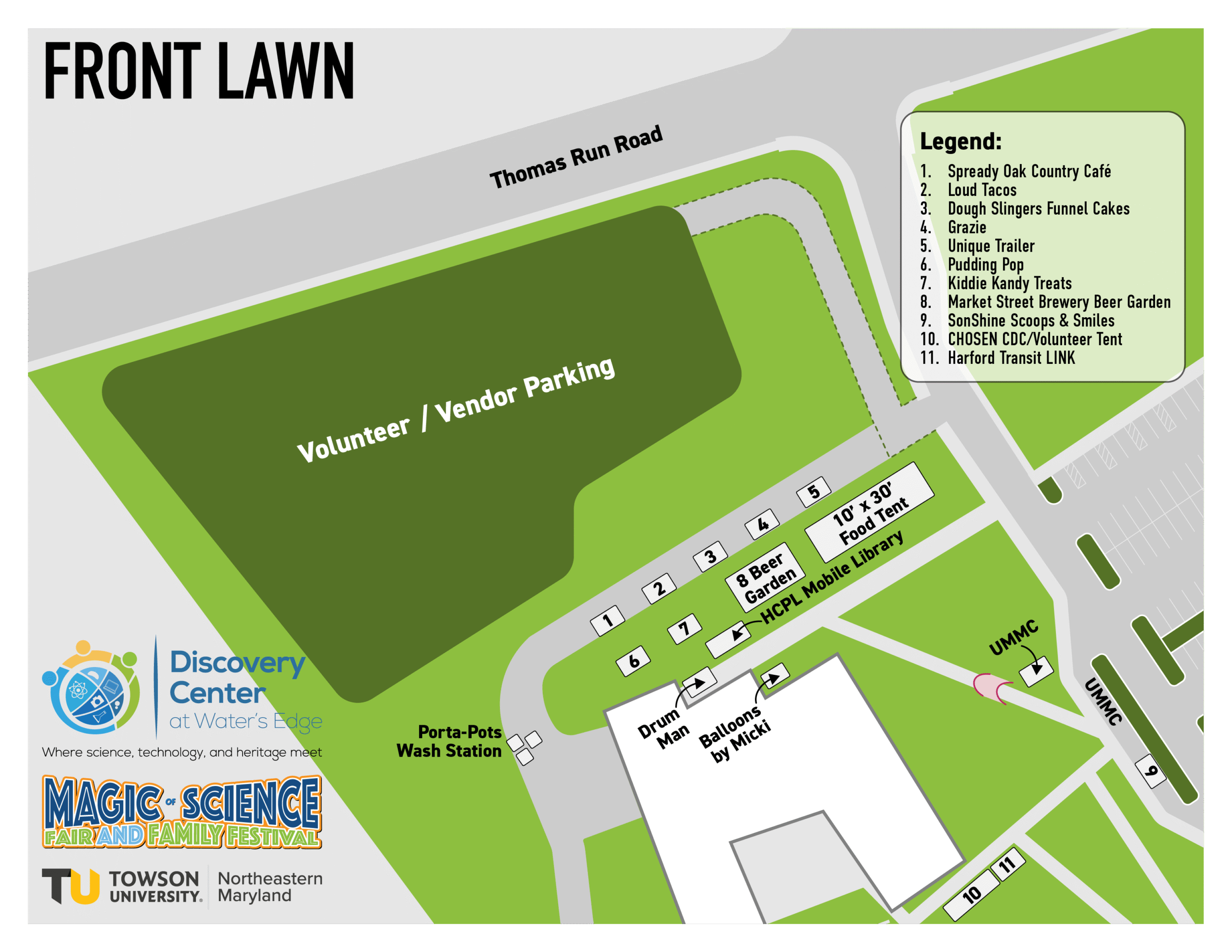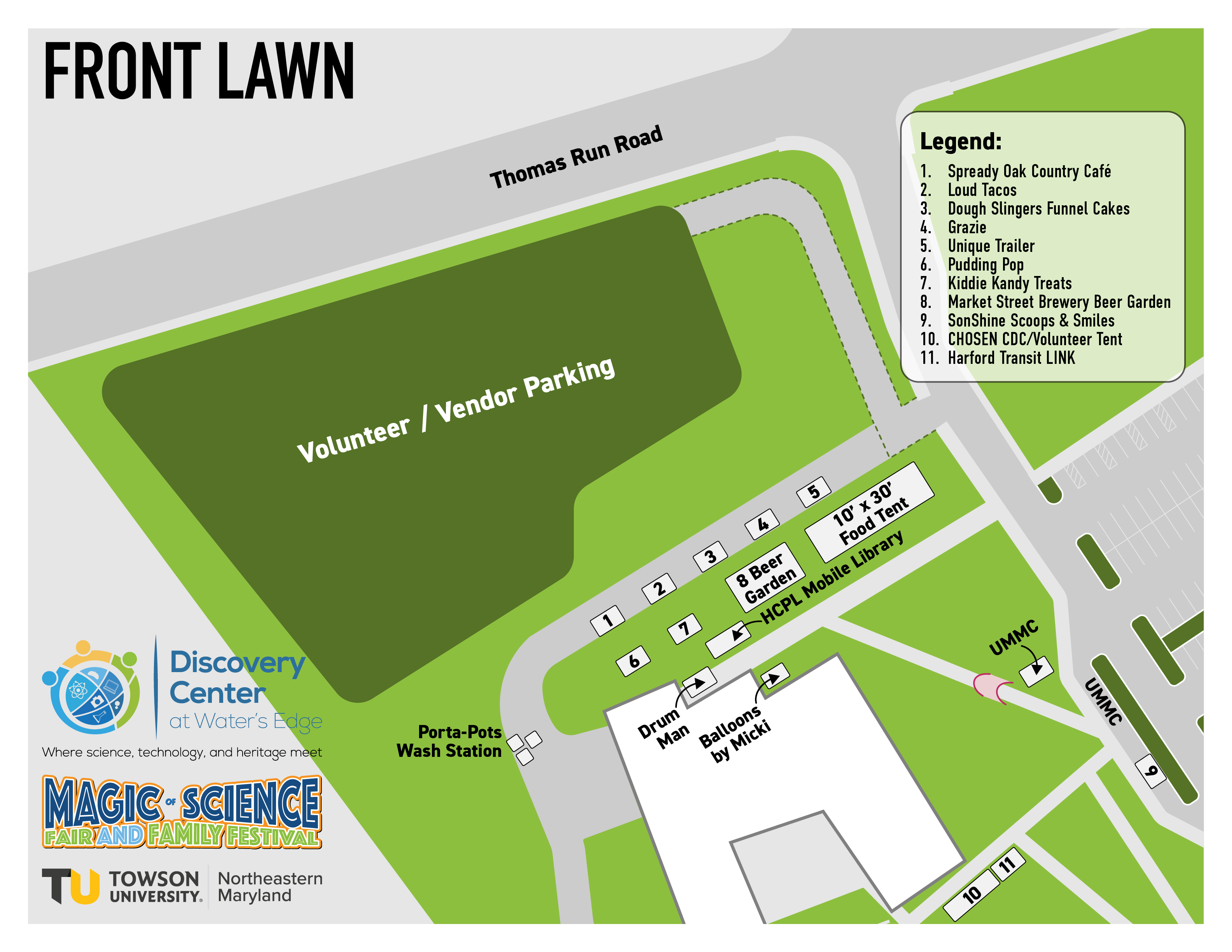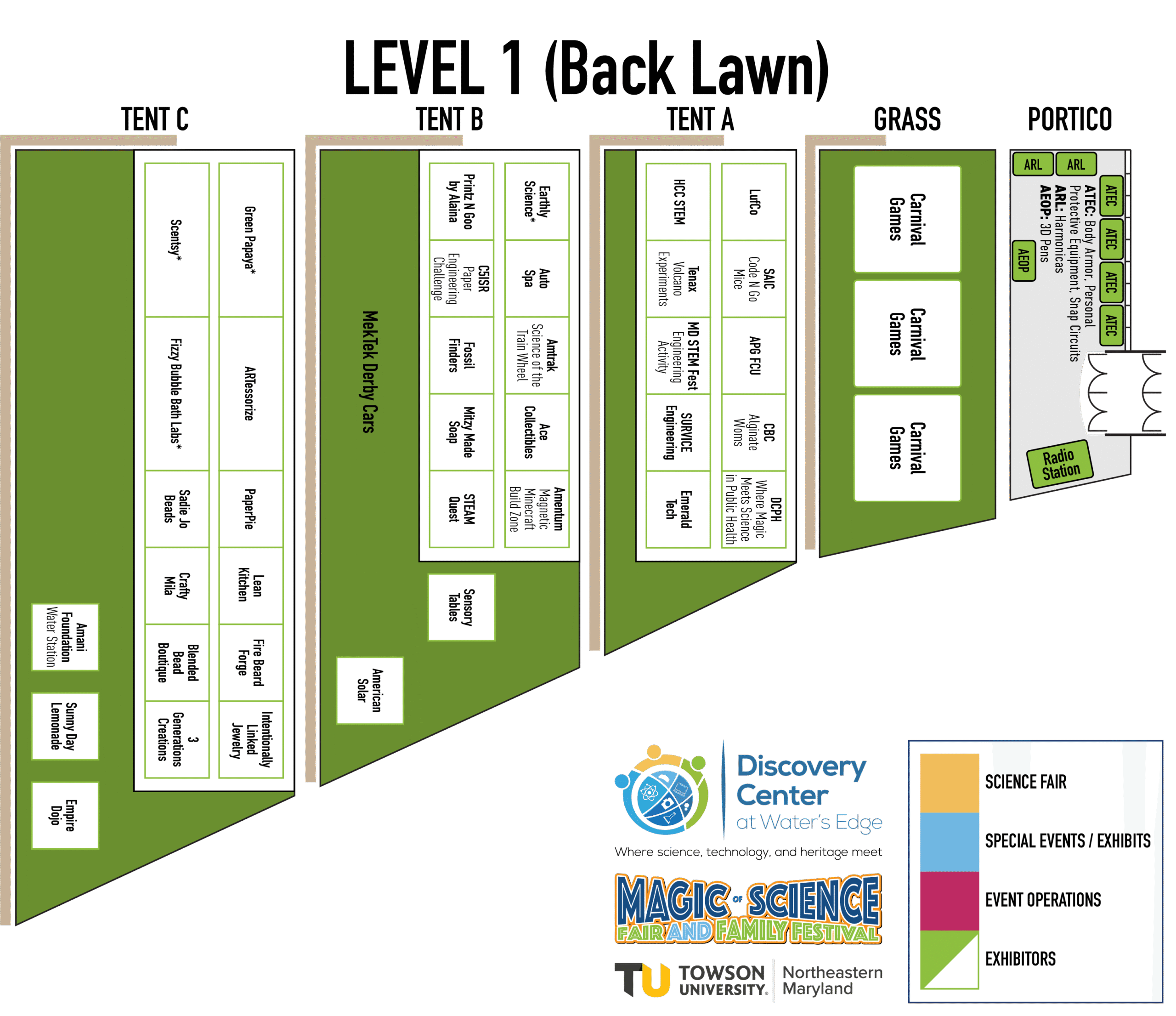 Volunteers that are scheduled to assist at the 2025 Magic of Science Fair and Family Festival should arrive at the TUNE Center, 510 Thomas Run Road, Bel Air, Md., (Entrance 7, see Overview Map) at their assigned time and check in at the Volunteer/Exhibitor Registration tent located on the side lawn near the parking lot unloading zone as depicted in the map shown below.