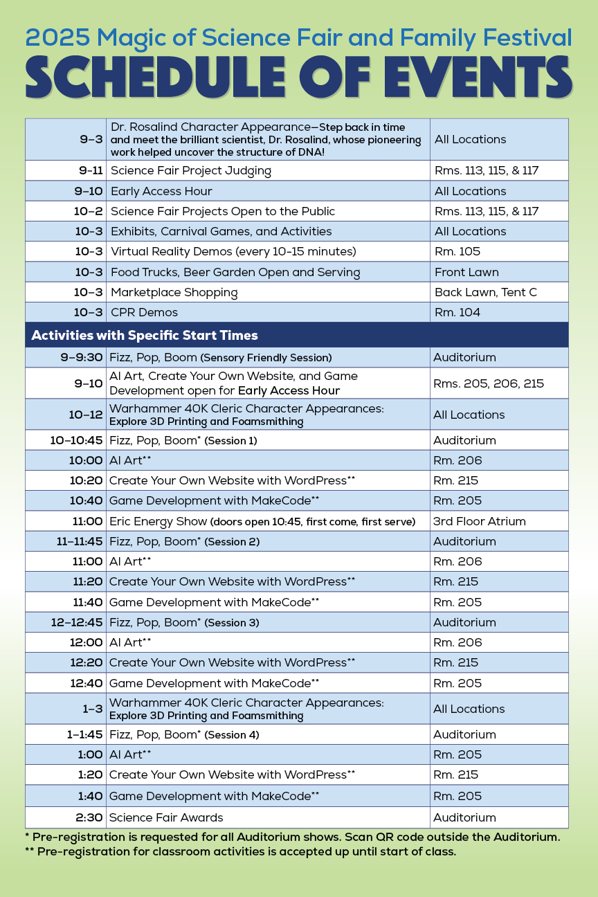 Check the weather and dress appropriately! Bring water, sunscreen, raincoat, etc. The 2025 Magic of Science Fair and Family Festival will happen rain or shine!